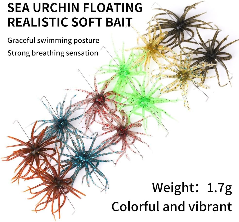 Discover the art of precision fishing with these lifelike sea urchin soft swimbaits. Each pack includes 12 pieces of intricately detailed lures featuring glitter-infused scales that create an irresistible underwater flash. At just 0.06 ounces each, these lightweight bionic baits drift naturally in the water, perfectly mimicking the movement of real sea creatures. The multi-tentacled design creates a mesmerizing action that proves especially effective in black pit and wild fishing scenarios. Available in an array of attractive colors including brown, pink, blue, gold, green, and dark brown, these versatile lures are specifically engineered to attract bass, pike, and other predatory fish. The soft, durable material ensures optimal performance and longevity, while the realistic appearance helps trigger aggressive strikes. Whether you're fishing in freshwater or saltwater environments, these floating lures provide the perfect combination of visibility and action to enhance your fishing success.